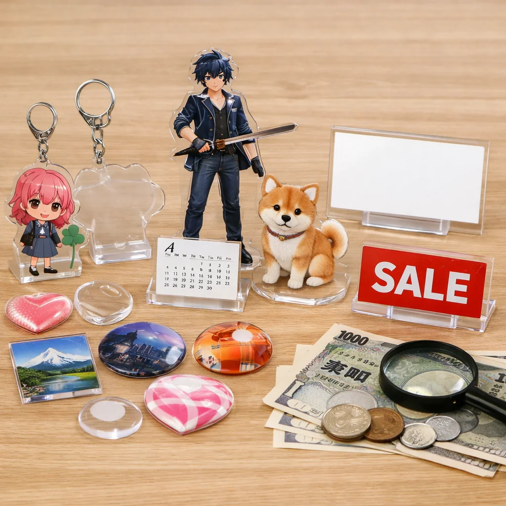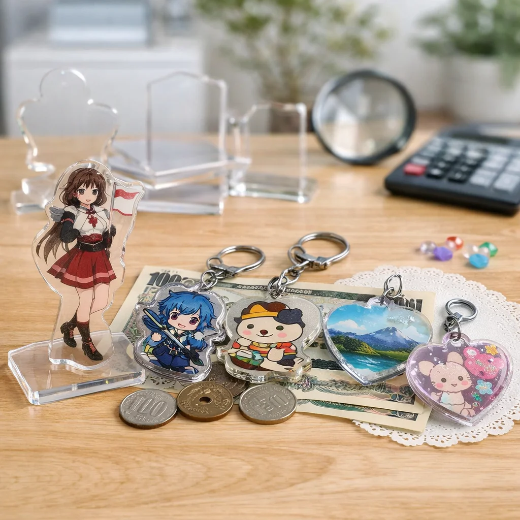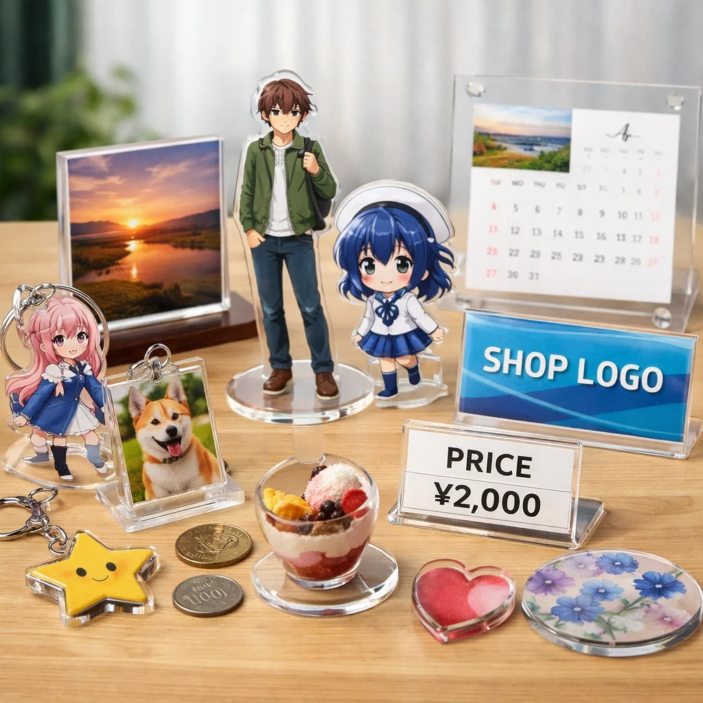 アクリルグッズは、透明度、発色、耐水性、加工性に優れたアイテムです。推し活、ノベルティ、同人、企業販促など様々なシーンで利用されています。価格は素材の厚みや透明度、加工によって変動します。アクリルの特性を理解し、お好みのグッズを見つけて楽しんでください。