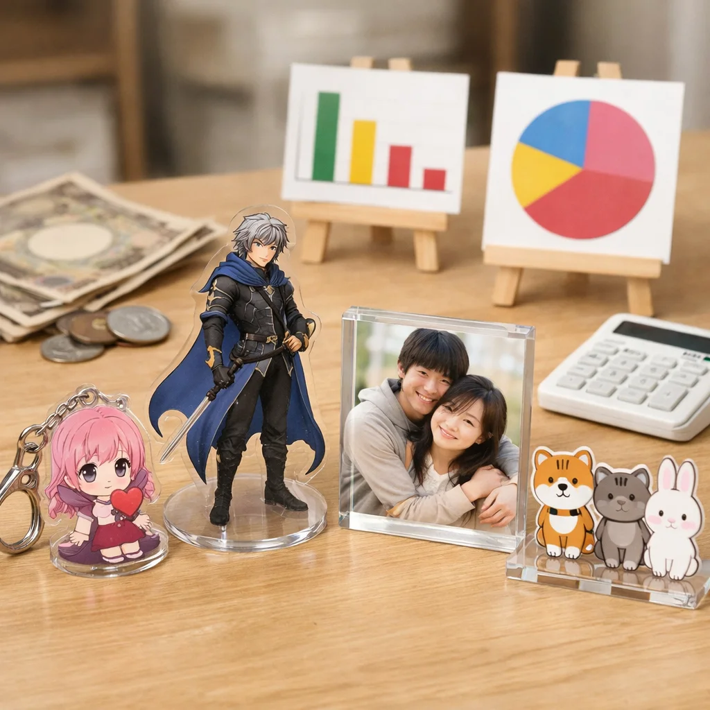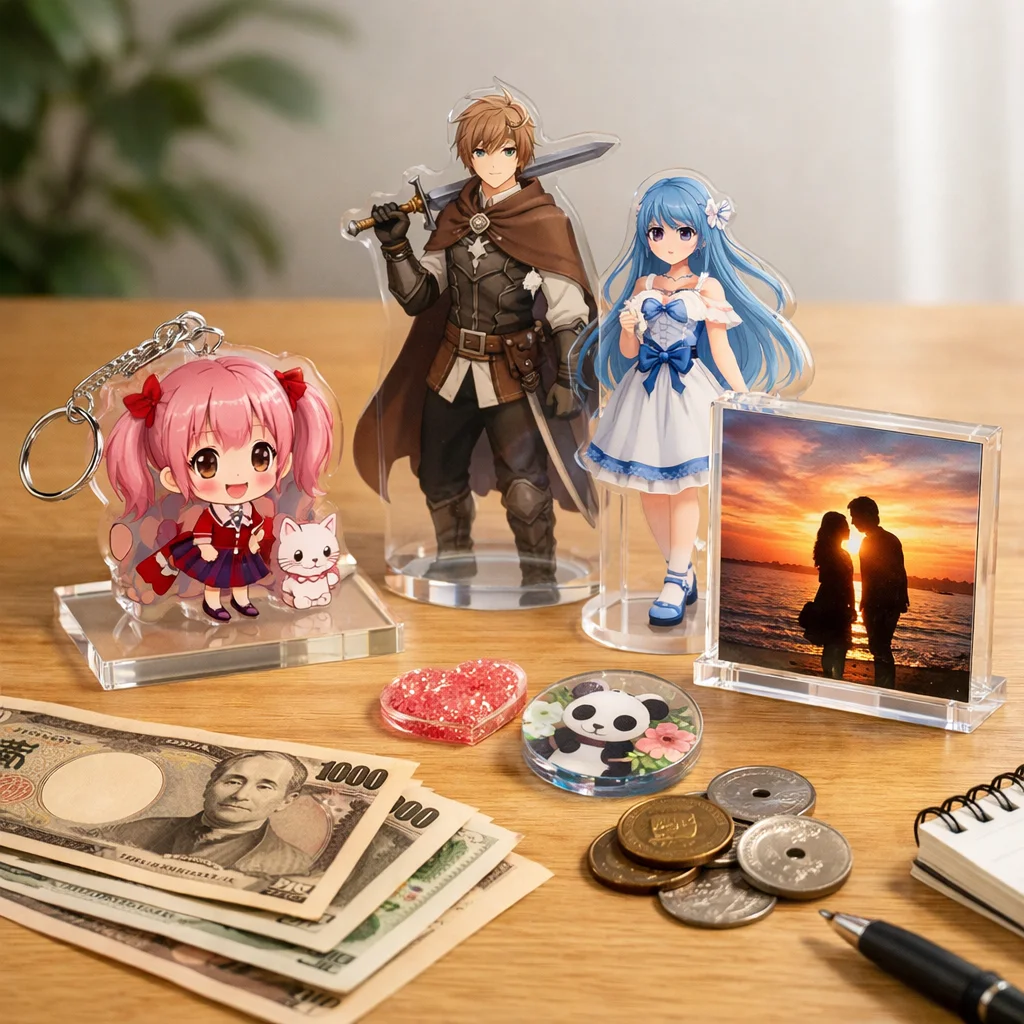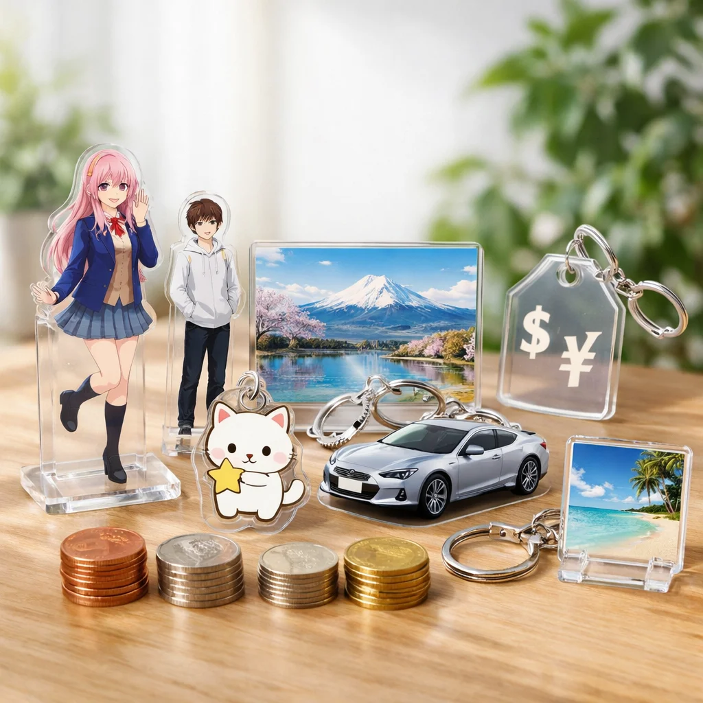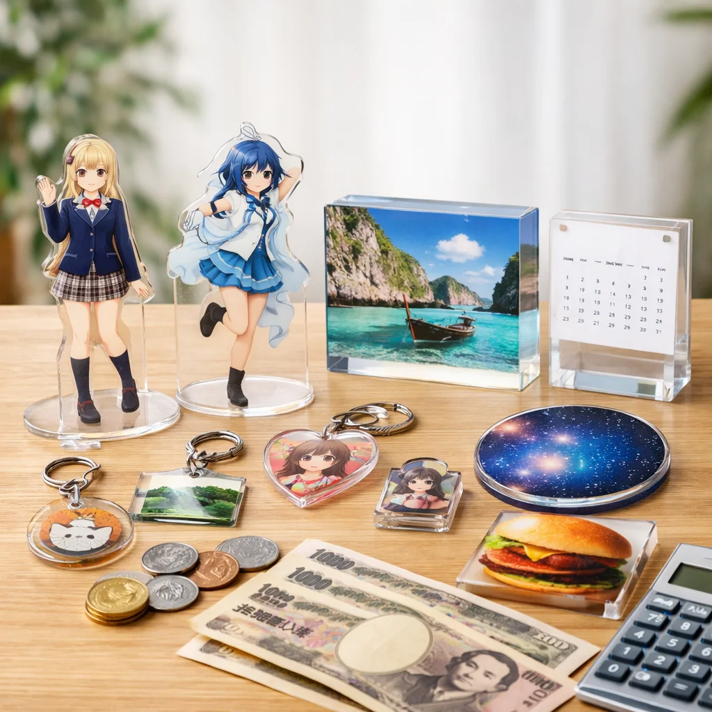 アクリルグッズは近年、様々な形で私たちの生活に取り入れられています。アクリルキーホルダー(アクキー)、アクリルスタンド(アクスタ)、アクリルバッジ、アクリルチャーム、アクリルブロック、スタンドプレートなど、その種類は多岐にわたります。これらのアクリルグッズの価格は、さまざまな要因によって変動します。これから、各アクリルグッズの特徴と共にそれに伴う価格の変動要因について詳しく見ていきましょう。