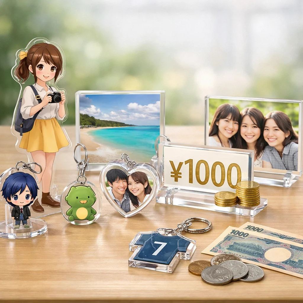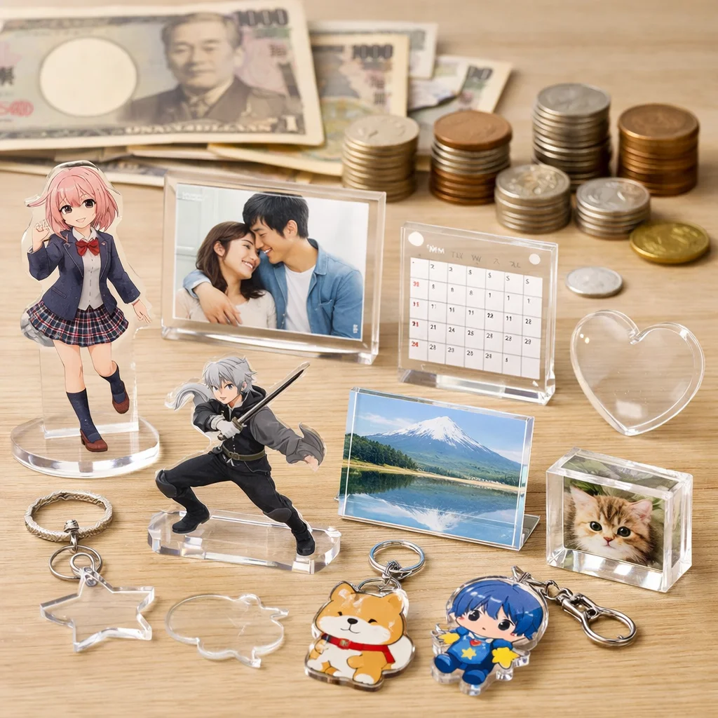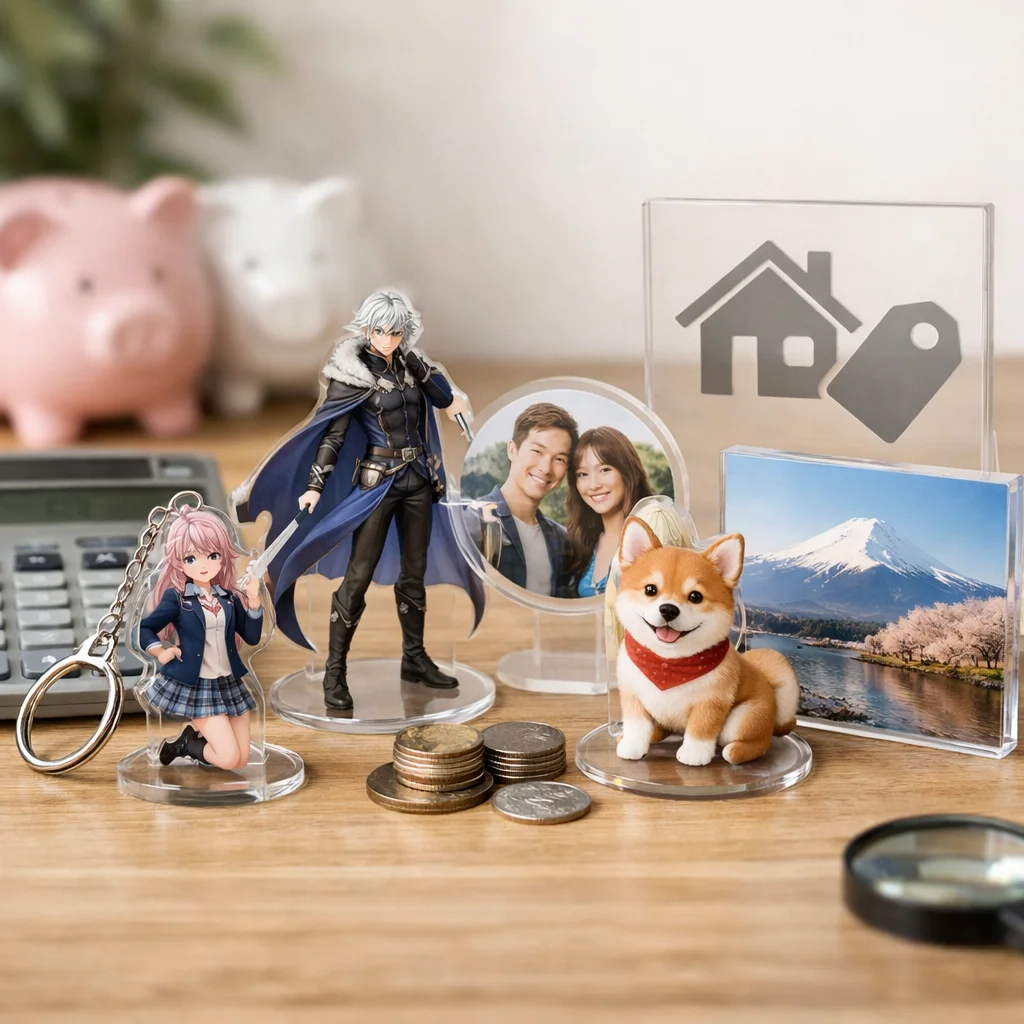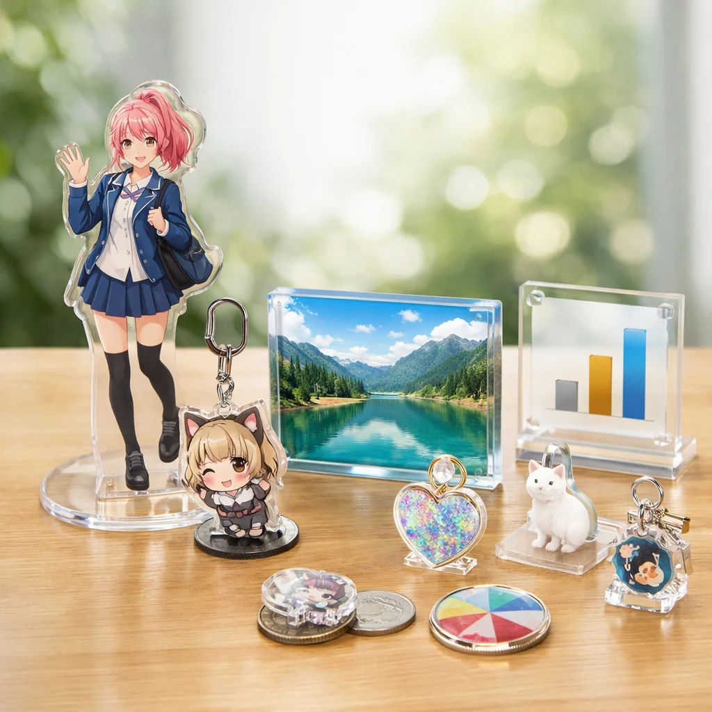 アクリルグッズは近年、様々な形で私たちの生活に取り入れられています。アクリルキーホルダー(アクキー)、アクリルスタンド(アクスタ)、アクリルバッジ、アクリルチャーム、アクリルブロック、スタンドプレートなど、その種類は多岐にわたります。これらのアクリルグッズの価格は、さまざまな要因によって変動します。これから、各アクリルグッズの特徴と共にそれに伴う価格の変動要因について詳しく見ていきましょう。