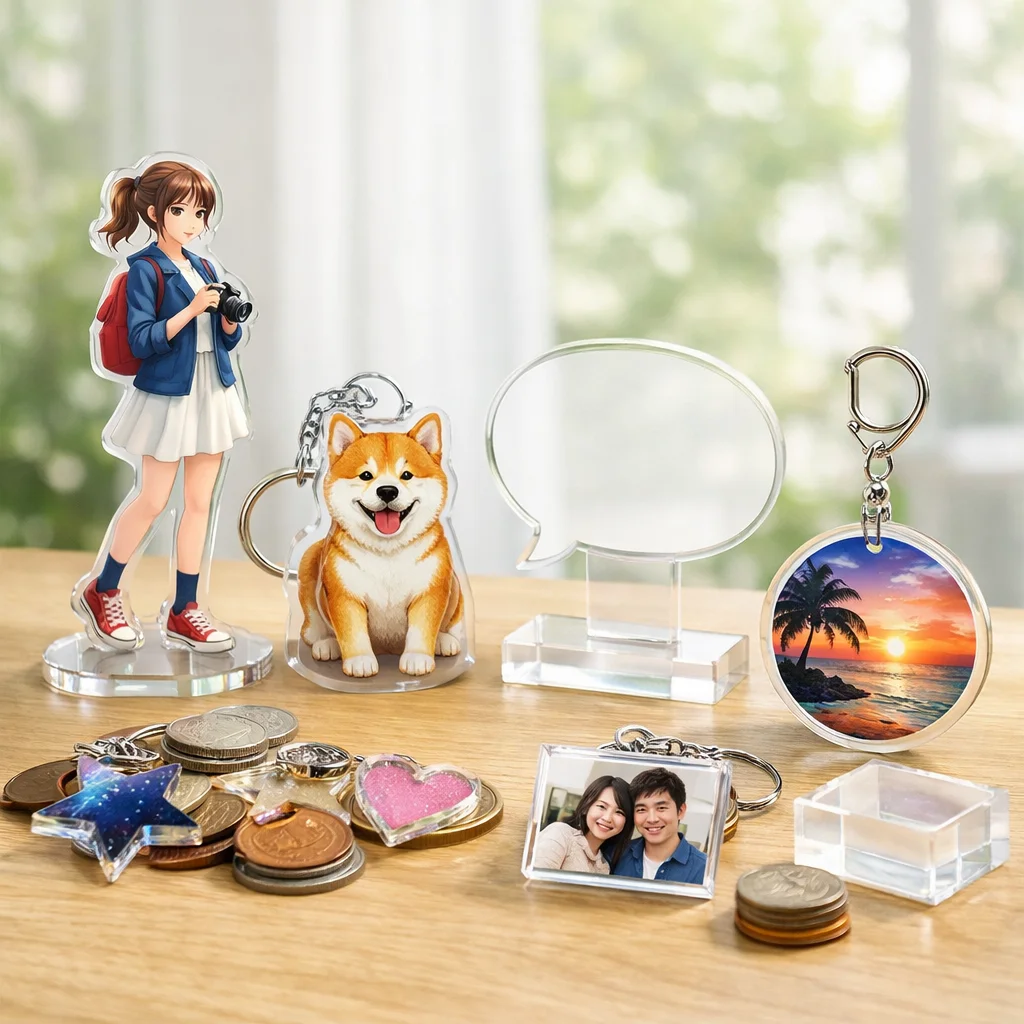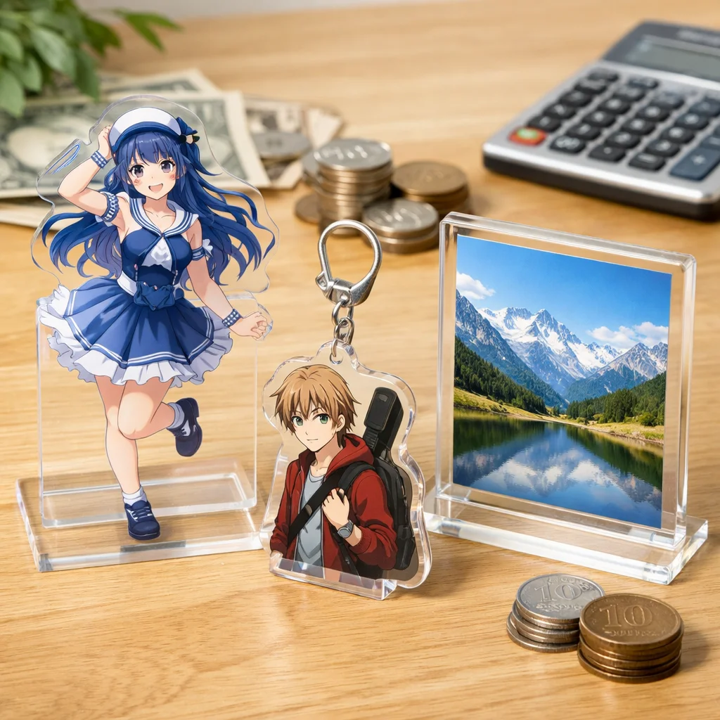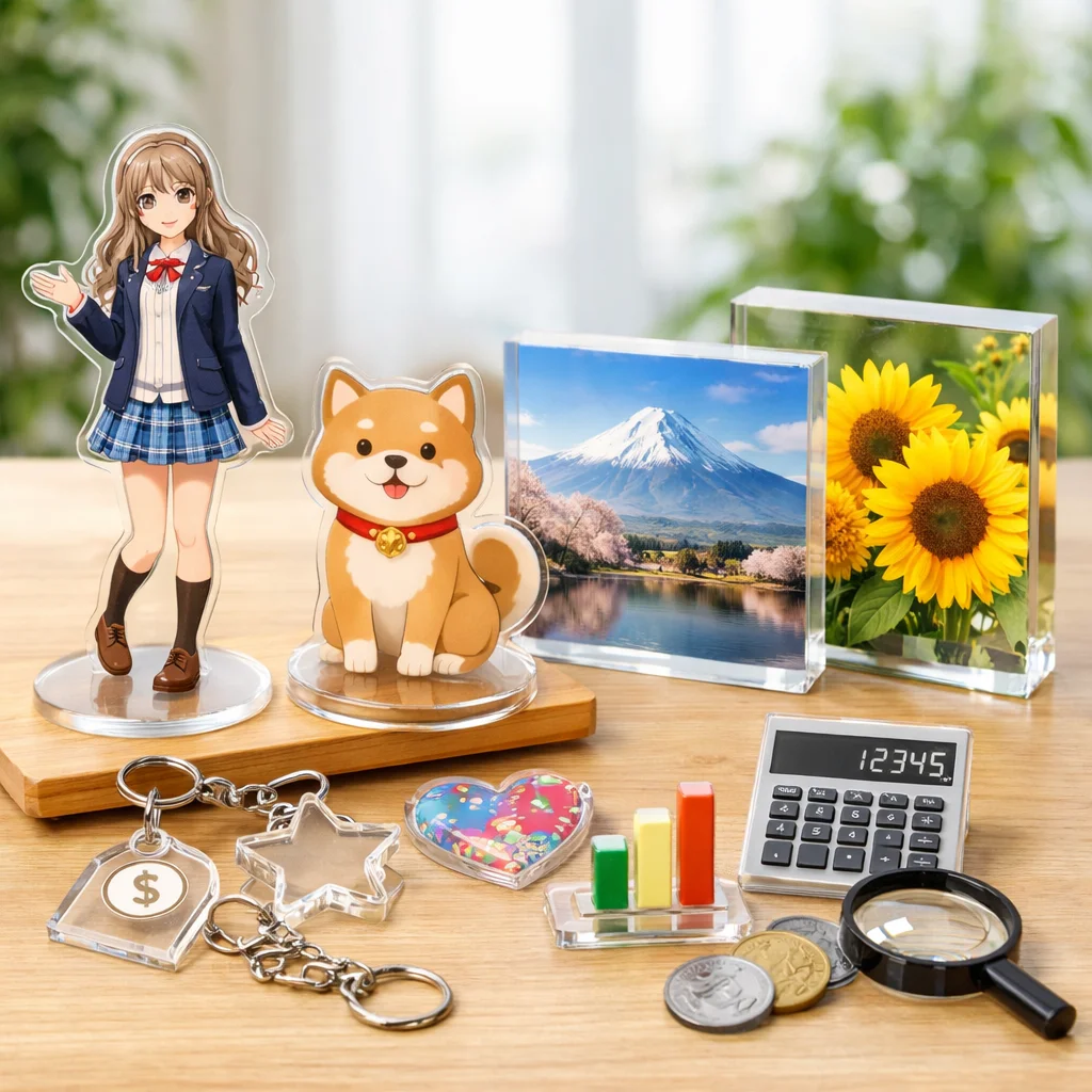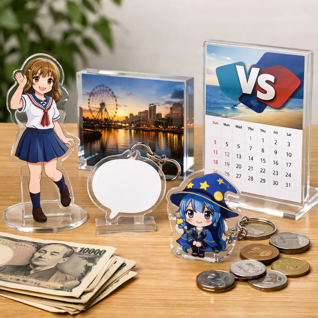 アクリルグッズは近年、様々な形で私たちの生活に取り入れられています。アクリルキーホルダー(アクキー)、アクリルスタンド(アクスタ)、アクリルバッジ、アクリルチャーム、アクリルブロック、スタンドプレートなど、その種類は多岐にわたります。これらのアクリルグッズの価格は、さまざまな要因によって変動します。これから、各アクリルグッズの特徴と共にそれに伴う価格の変動要因について詳しく見ていきましょう。