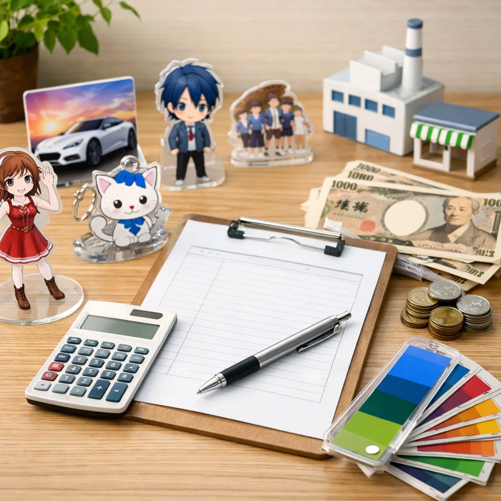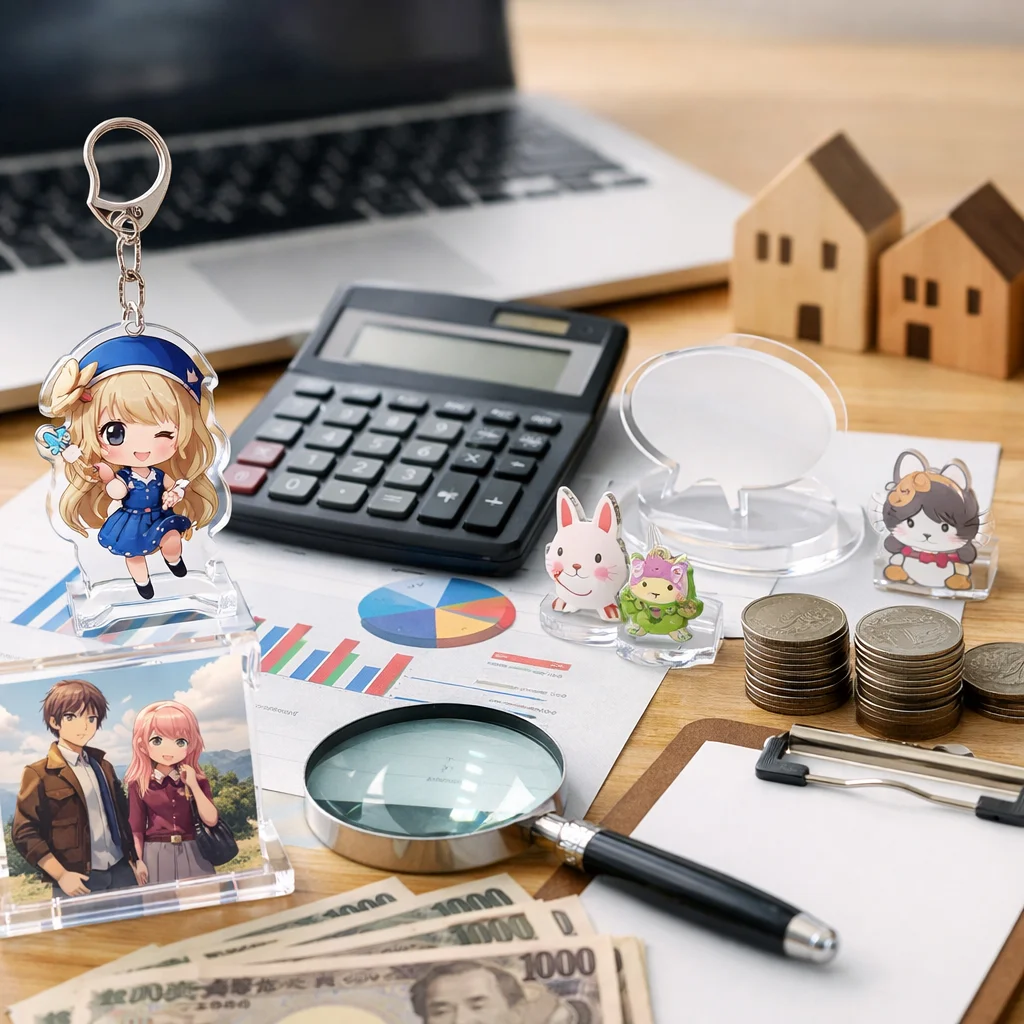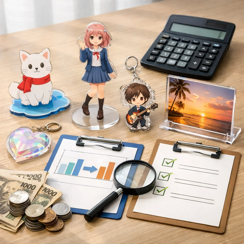 アクリルグッズの制作を検討している同人作家、企業のノベルティ担当者、イベント主催者の皆様へ。価格表だけでなく、見積もりを依頼することの重要性をご存知でしょうか?本記事では、アクリルグッズの見積もりがなぜ必要なのか、そして見積もりで決まる費用要素(サイズ、厚み、印刷、カット、個数、包装、送料、納期)を俯瞰して説明します。さらに、アクリルグッズの見積もりを比較する際のポイントや注意点、選び方についても詳しく解説します。