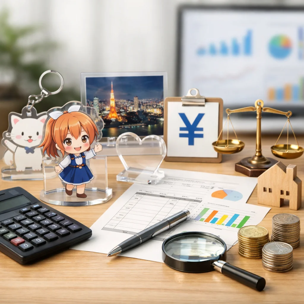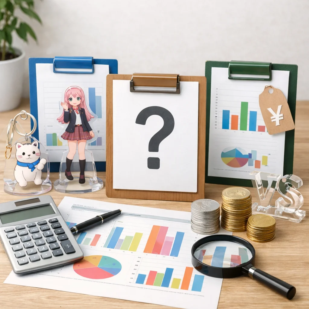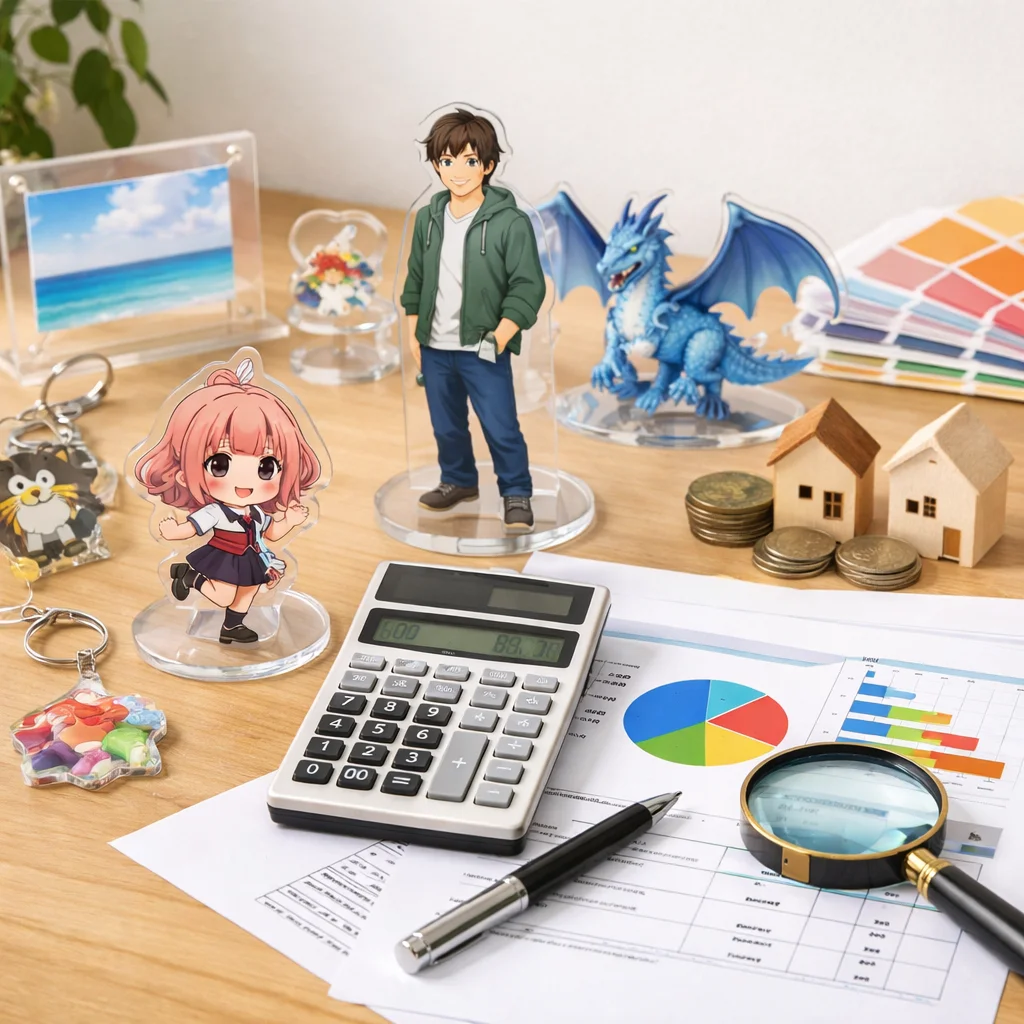 アクリルグッズの制作を検討している同人作家、企業のノベルティ担当者、イベント主催者の皆様へ。価格表だけでなく、見積もりを依頼することの重要性をご存知でしょうか?本記事では、アクリルグッズの見積もりがなぜ必要なのか、そして見積もりで決まる費用要素(サイズ、厚み、印刷、カット、個数、包装、送料、納期)を俯瞰して説明します。さらに、アクリルグッズの見積もりを比較する際のポイントや注意点、選び方についても詳しく解説します。