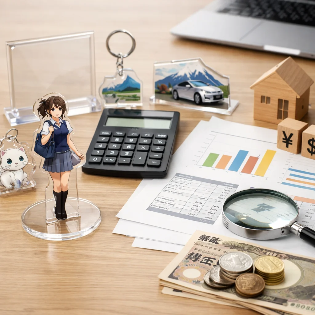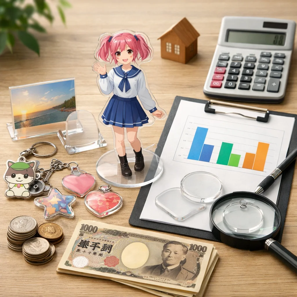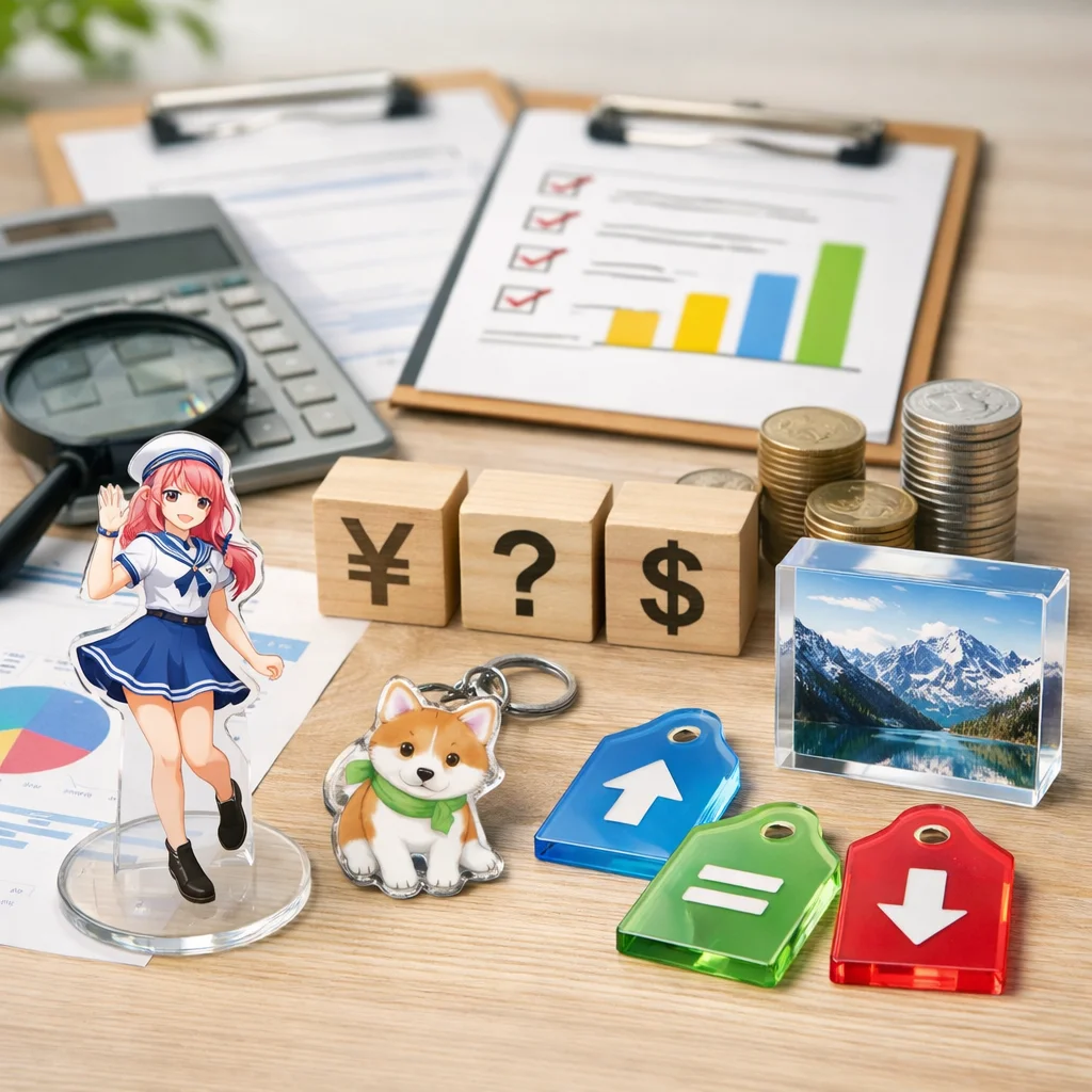 アクリルグッズの価格は、サイズ、厚み、印刷範囲、台座の有無、OPP個装などによって大きく変動します。用途別に見ると、小型のアクキーやアクリルバッジは安価で、大型のスタンドPOPは高めの傾向があります。見積もり時にはこれらの要因を考慮して比較検討することが重要です。