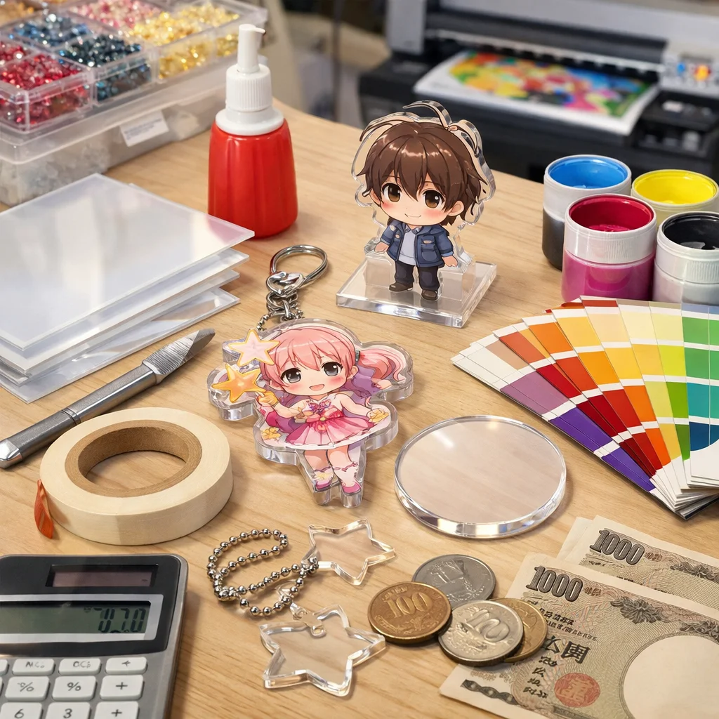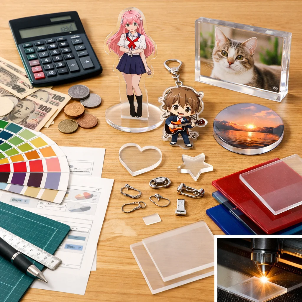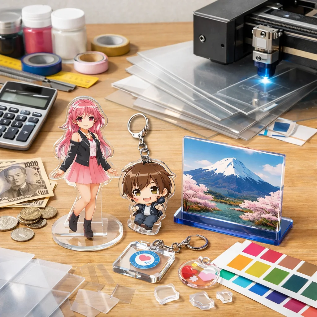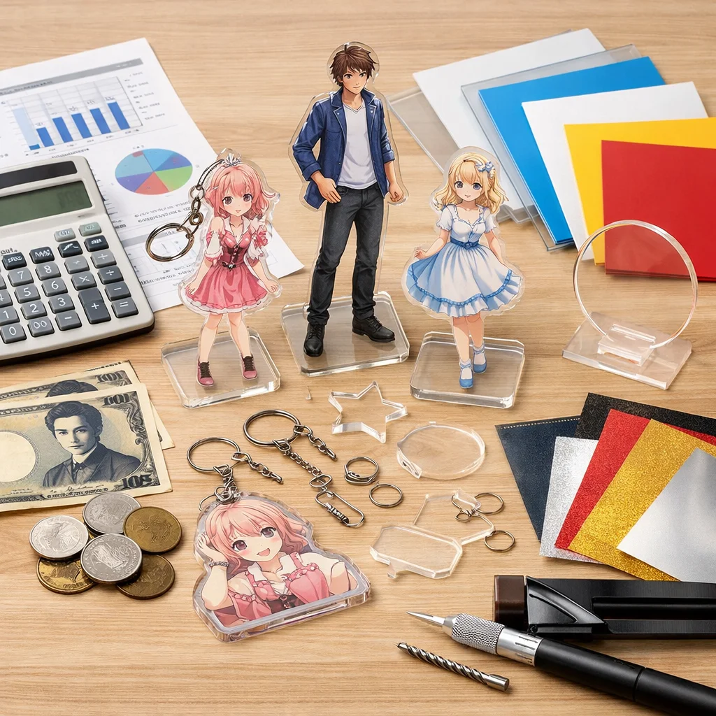 アクリルグッズの費用はタイプやデザインにより異なります。代表的な商品では、アクリルキーホルダーが300円~800円、アクリルスタンドが600円~2,000円など、サイズ、厚み、印刷面数、パーツ点数、台座有無、金具の種類が費用に影響します。具体的な見積もりを取ることが重要です。