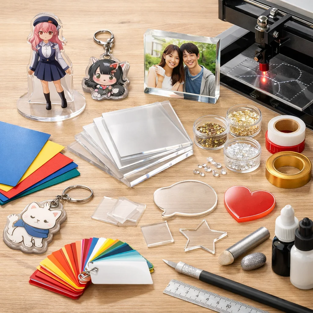 効率的な材料選びは、アクリルグッズの製造において非常に重要なポイントです。アクリルの特性や仕上がりに影響を与える要素には、板厚(2mm/3mm/5mmなど)、透明/カラー、キャスト/押出のタイプがあり、これらはそれぞれコストや加工性に影響を及ぼします。以下では、これらの違いと、用途別の推奨を詳しく説明し、材料ロスを減らすためのサイズ設計の観点にも触れていきます。