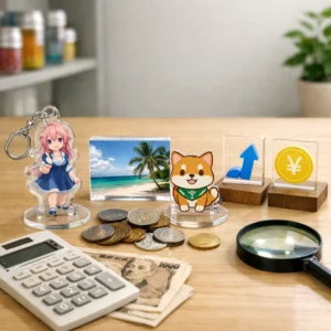 これらの費用を合計すると、外注でアクリルグッズを作成する場合は、初期投資は数万円から数十万円になる場合があります。特にデザインのクオリティや数量によって大きく変動します。