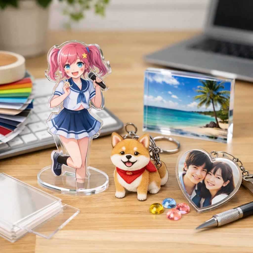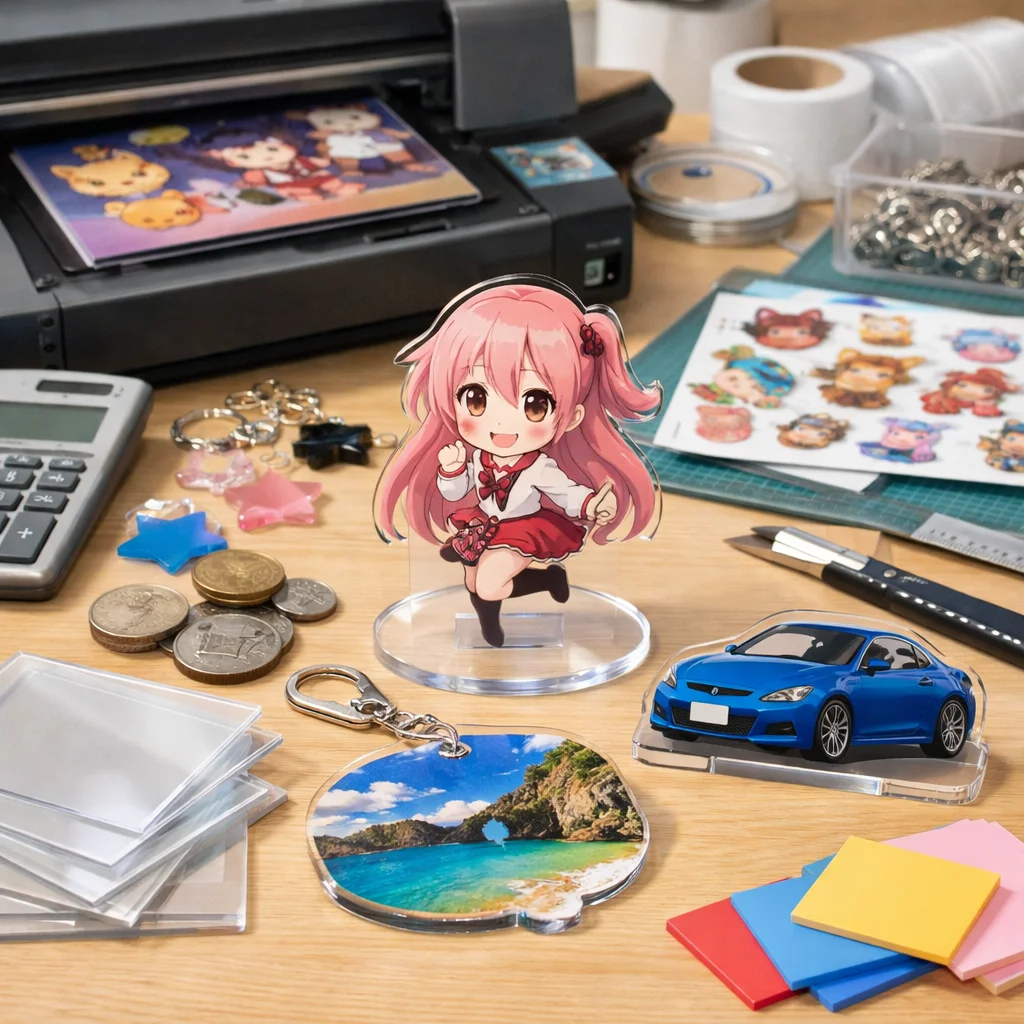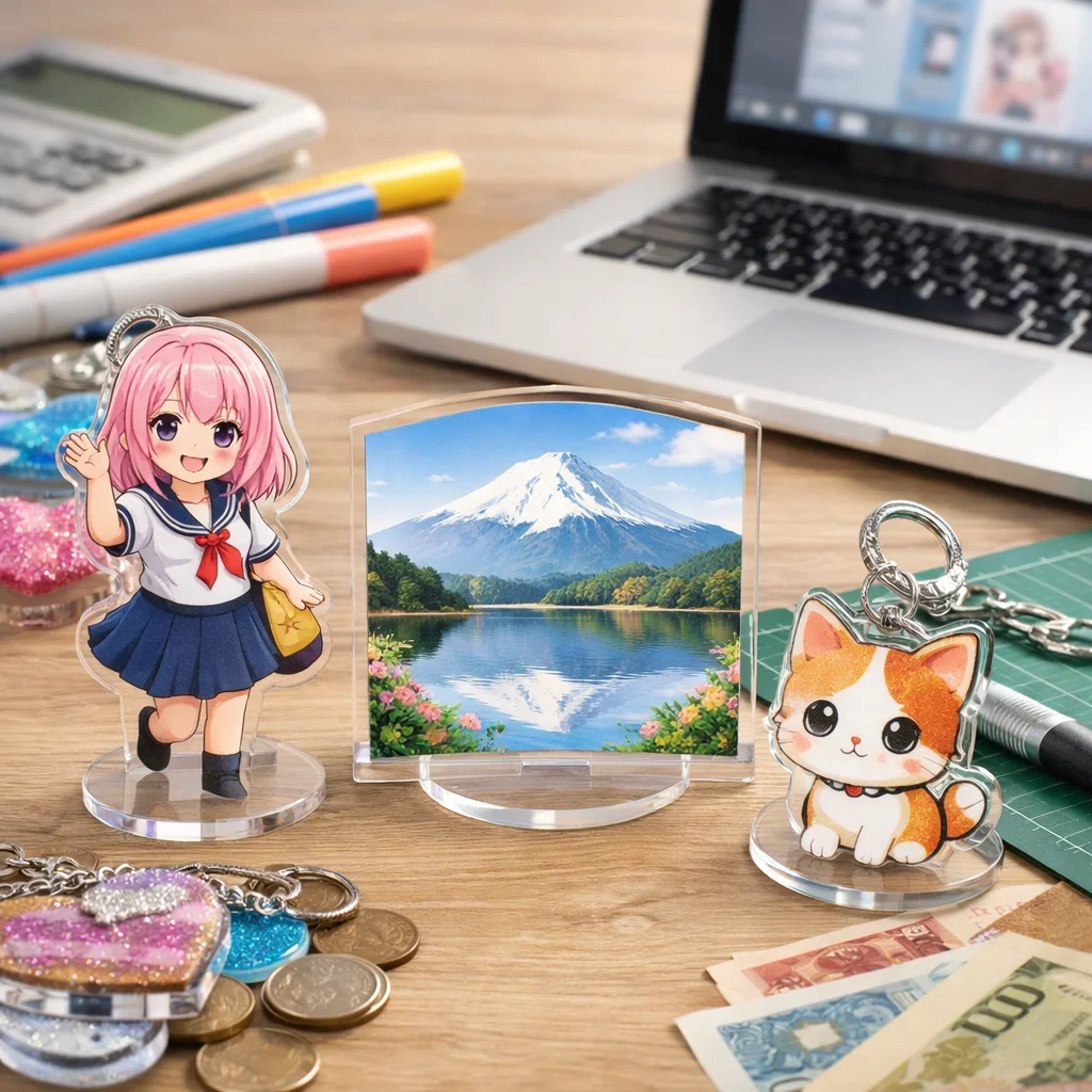 アクリルグッズとは、アクリル板を加工し、印刷した商品を指します。透明な素材でできているため、デザインの発色が良く、さまざまな形や大きさに加工することが可能です。代表的なアクリルグッズには、アクリルキーホルダー(通称「アクキー」)、アクリルスタンド、アクリルバッジなどがあります。これらは手軽で、見た目にも美しいため、多くの人々に愛されています。