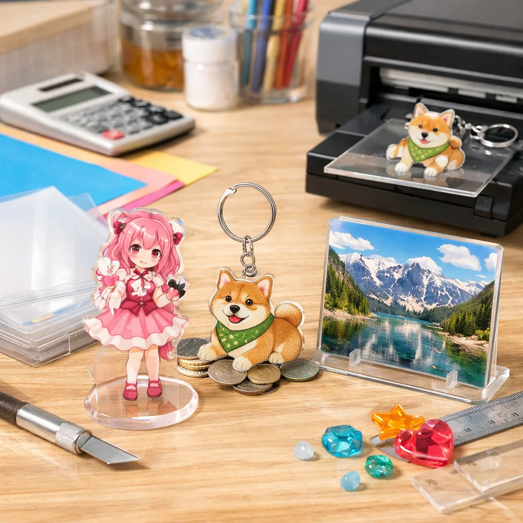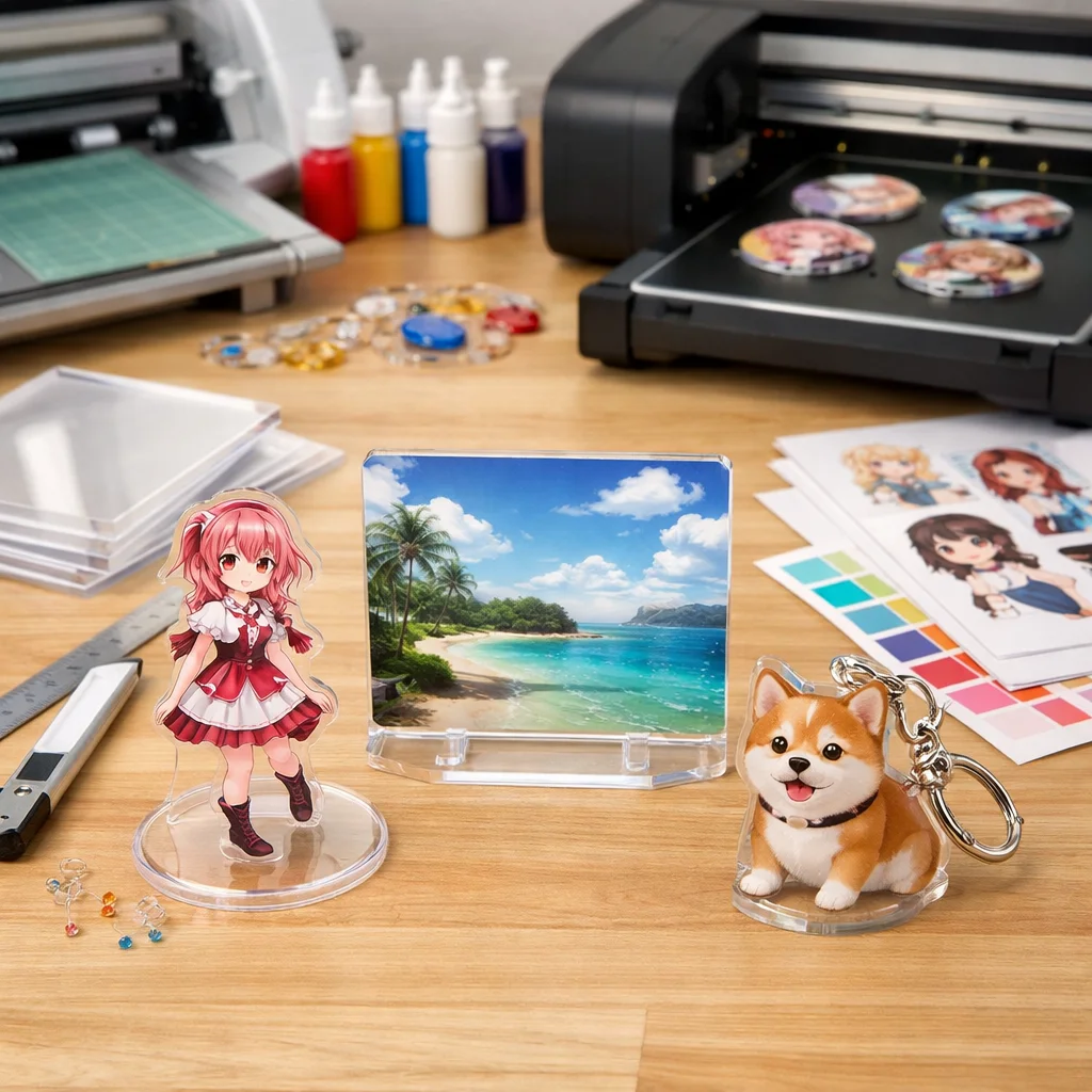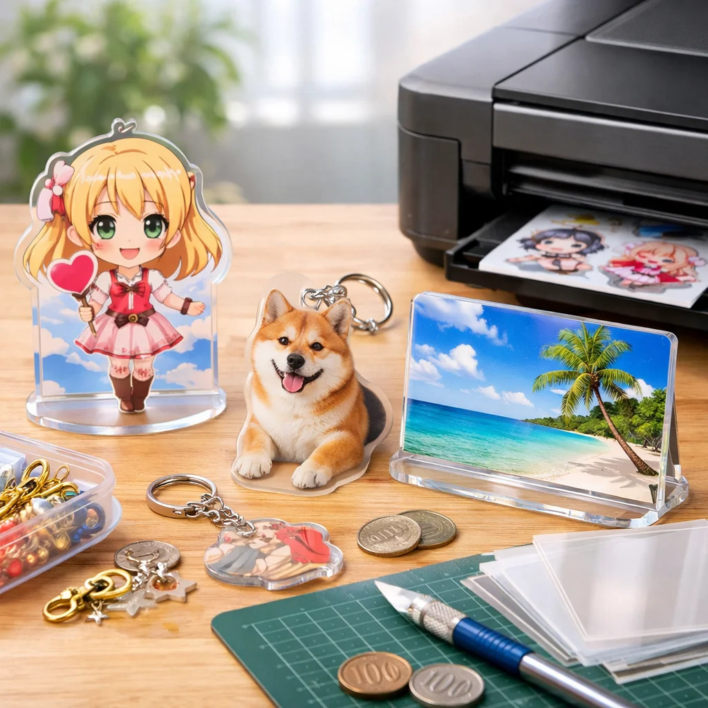 アクリルグッズとは、アクリル板を加工し、印刷した商品を指します。透明な素材でできているため、デザインの発色が良く、さまざまな形や大きさに加工することが可能です。代表的なアクリルグッズには、アクリルキーホルダー(通称「アクキー」)、アクリルスタンド、アクリルバッジなどがあります。これらは手軽で、見た目にも美しいため、多くの人々に愛されています。