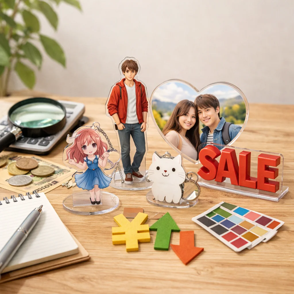 最後に、アクリルグッズの制作において注意すべき点は、正しい予算設定がその後の販売にも大きく影響するということです。特に、安い価格設定で販売したい場合でも、コストを削りすぎると製品の品質が下がり、逆に売上に悪影響を与えることがあります。良質なアクリルグッズを提供するためには、適正な予算配分が必須です。