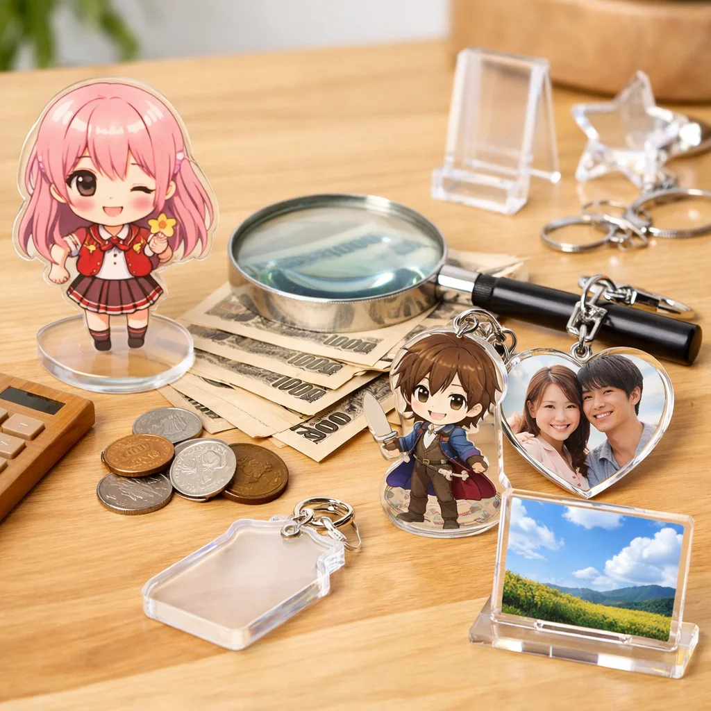 次に、安い制作に向く標準仕様とは、最もシンプルでコスト面にも優れた、例えるなら、2mmの透明アクリル板を使用し、付属品も最小限に抑えることによって実現されます。一方で、高価になりやすい素材は、3mm以上の厚さや、特殊な加工が施されたアクリル板です。このような材料を選択すると、通常のアクリルグッズに比べてコストがかさむため、注意が必要です。