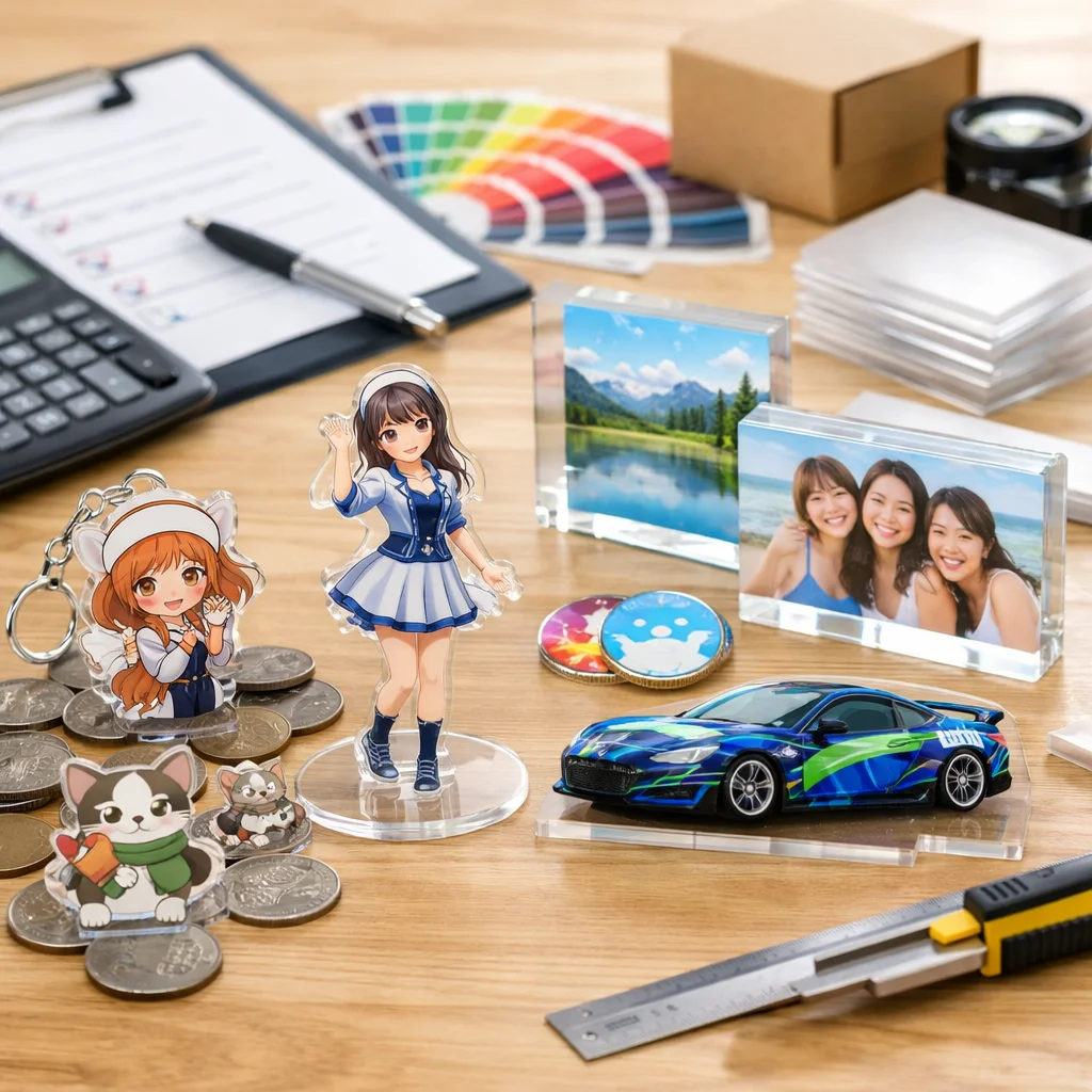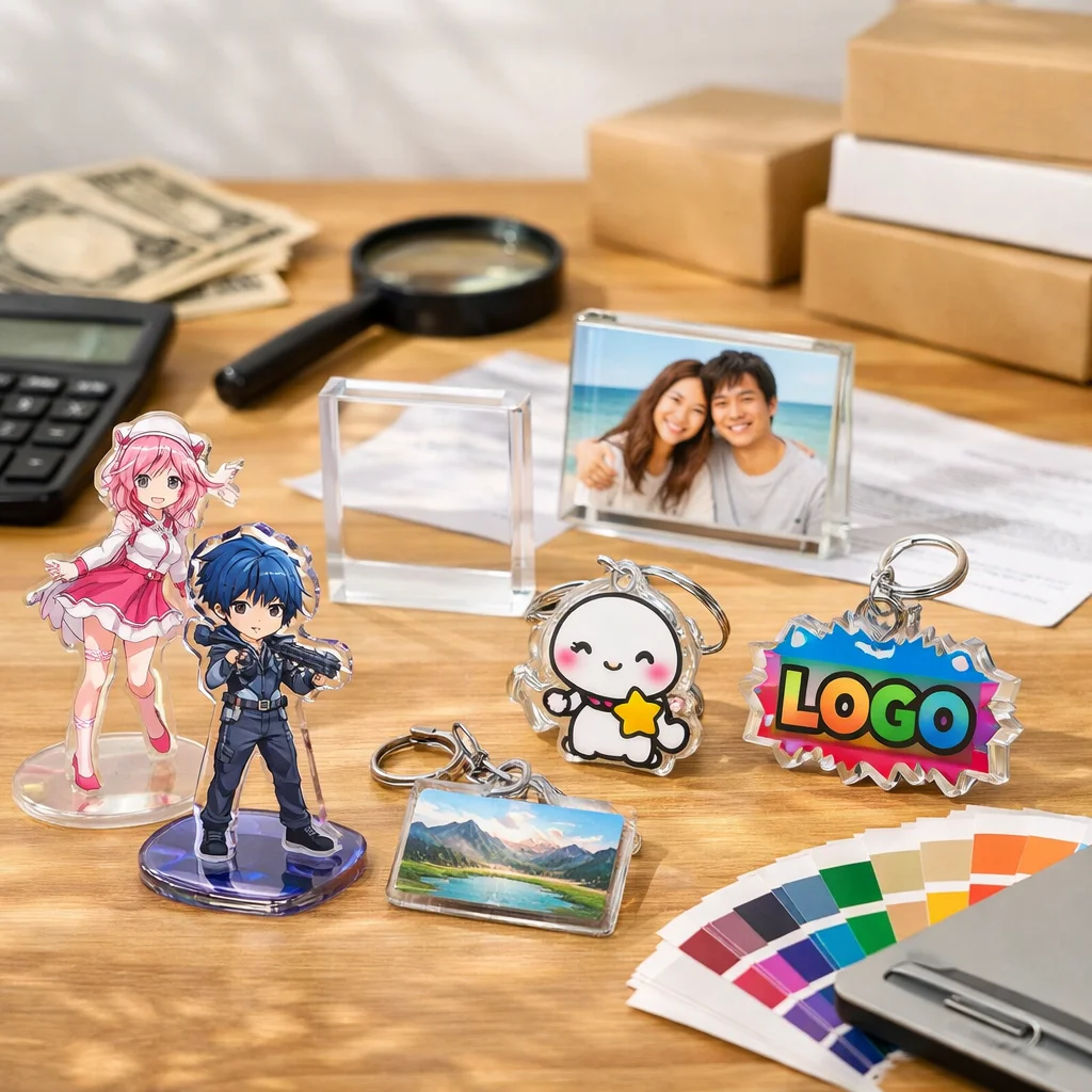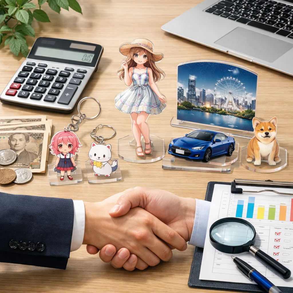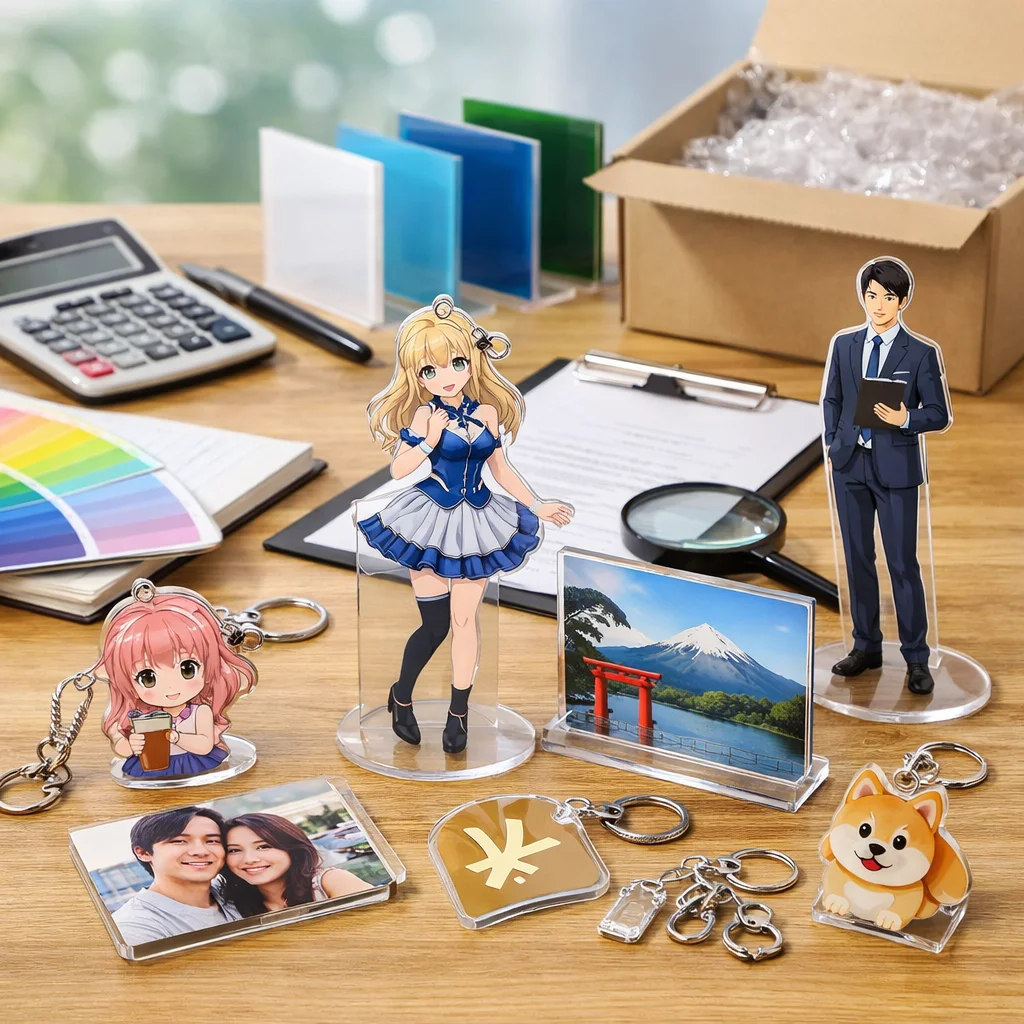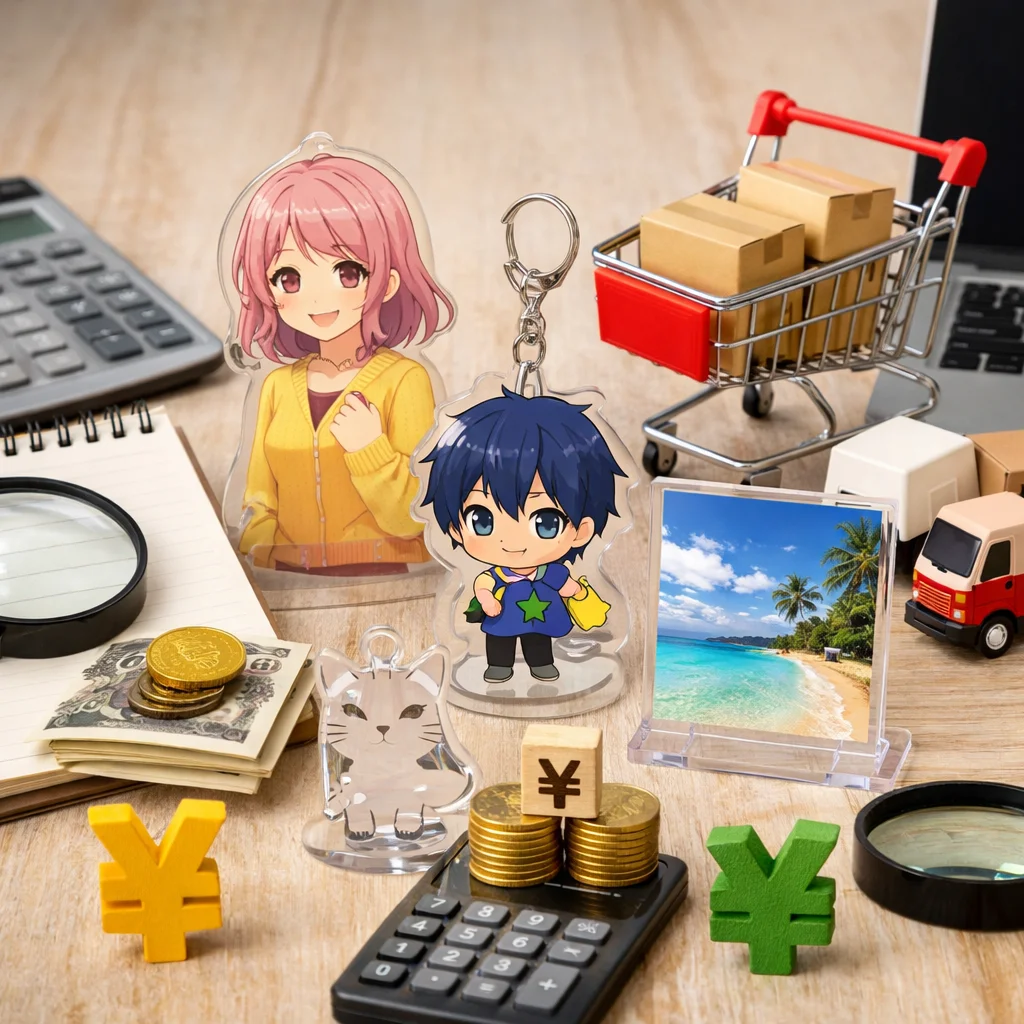 アクリルグッズを選ぶ際は、コストに影響する要因(サイズ、厚み、数量、印刷方式、カット、包装、送料、納期)をしっかり理解しましょう。また、見積もりの単価は税別、送料別、オプション別であることを忘れずに確認してください。事前に仕様を固定しておくことも、最安値を実現するために重要です。
