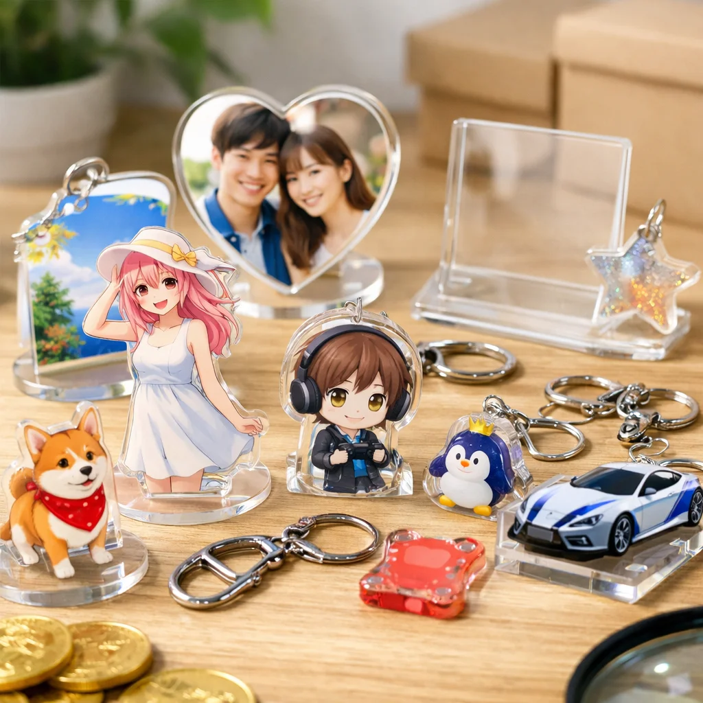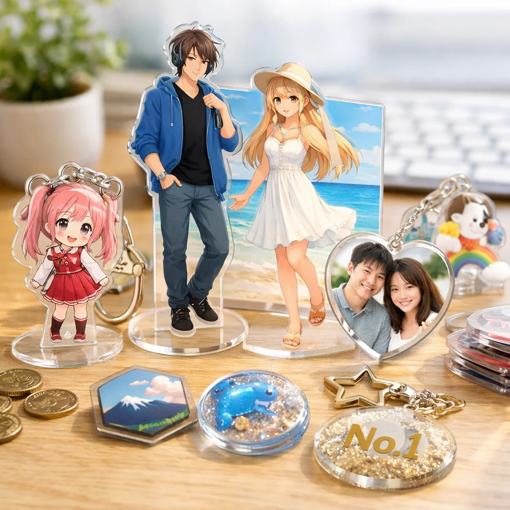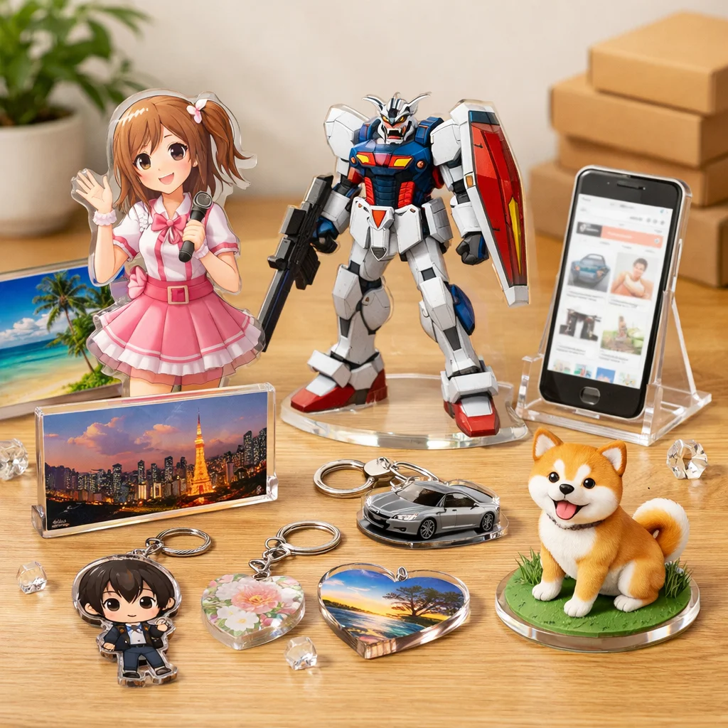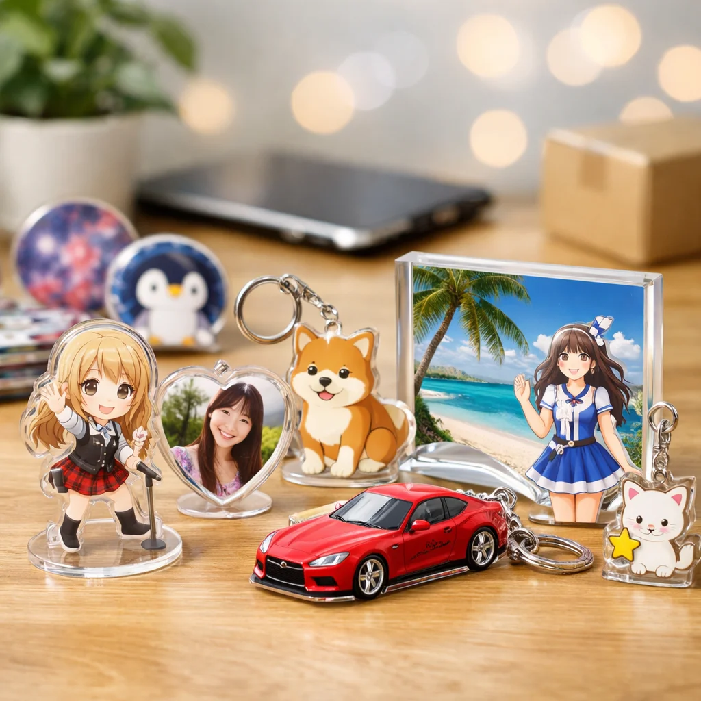 アクリルグッズは、その透明感と軽さから、アクスタ(アクリルスタンド)、キーホルダー、スタンプ、フォトフレームなど、多彩なアイテムが展開されています。