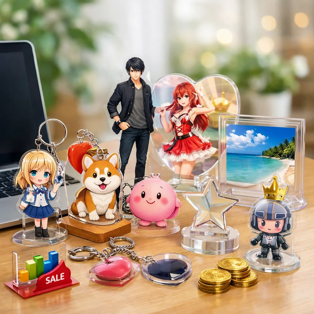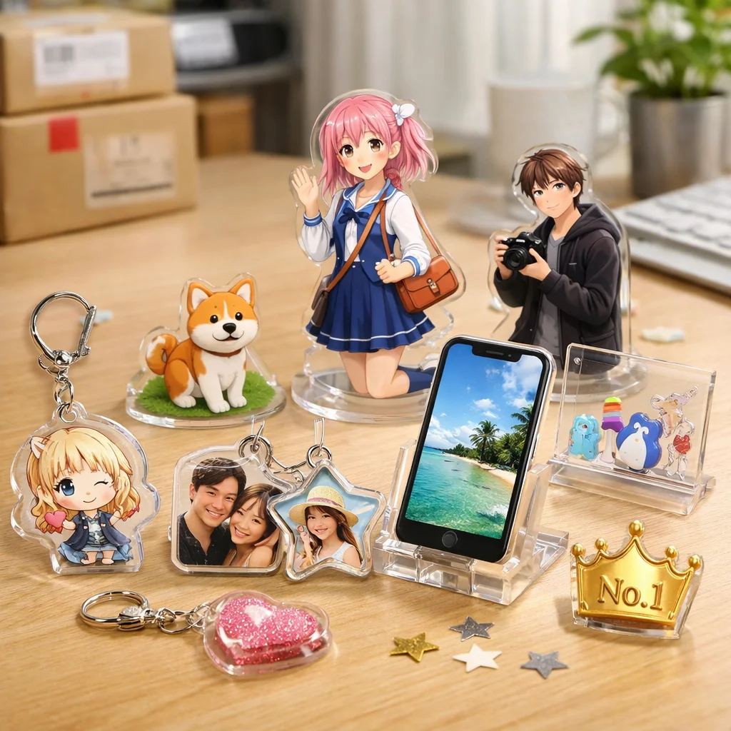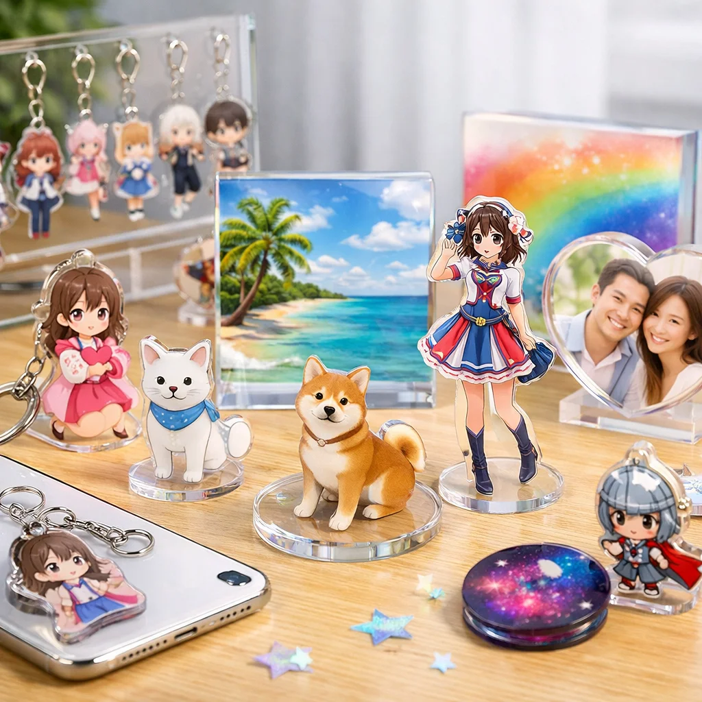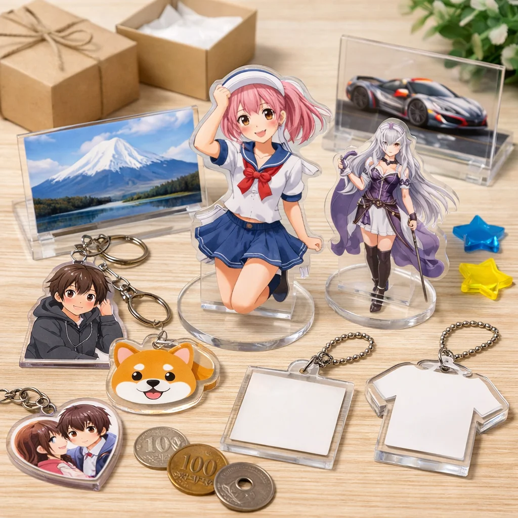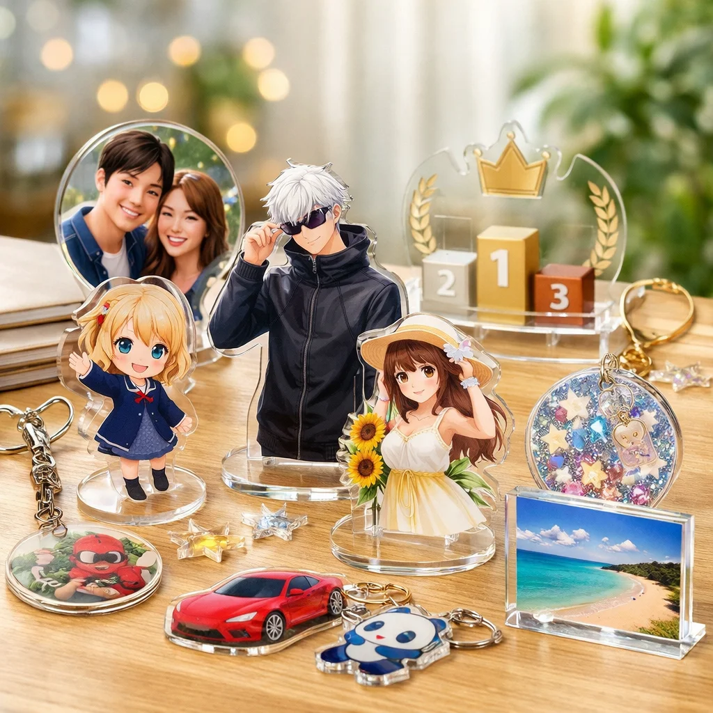 アクリルグッズは、その透明感と軽さから、アクスタ(アクリルスタンド)、キーホルダー、スタンプ、フォトフレームなど、多彩なアイテムが展開されています。