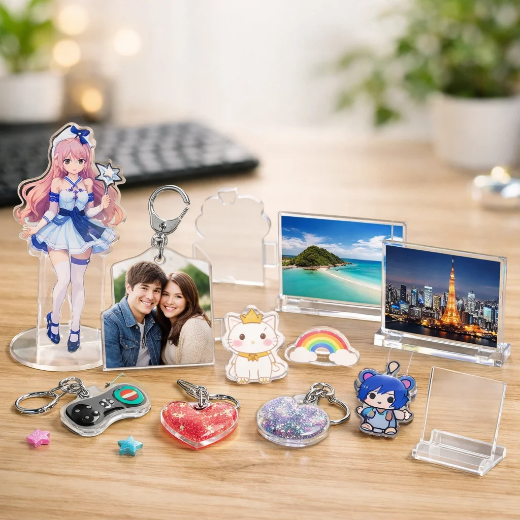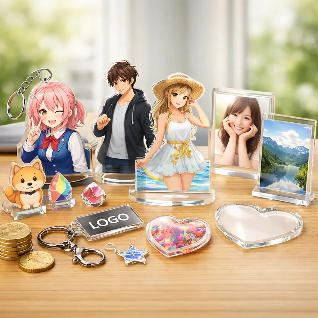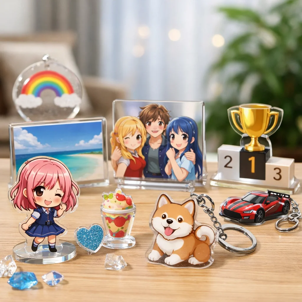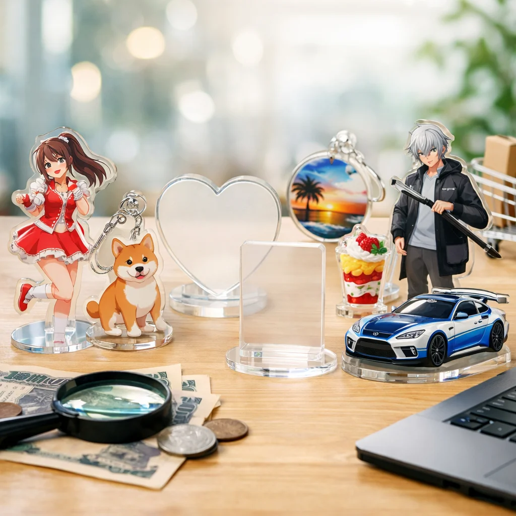 アクリルグッズは、その透明感と軽さから、アクスタ(アクリルスタンド)、キーホルダー、スタンプ、フォトフレームなど、多彩なアイテムが展開されています。