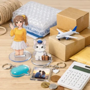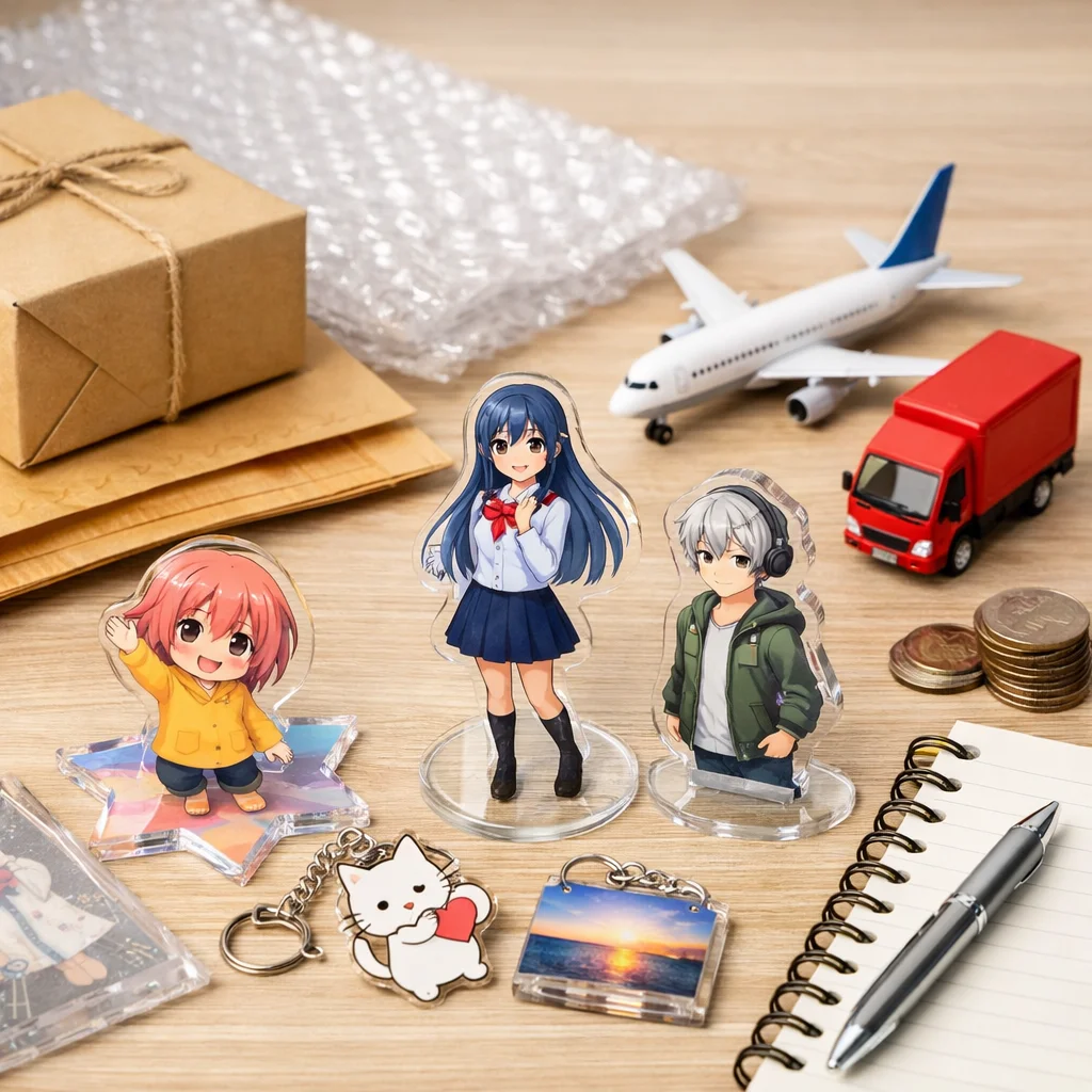 - 梱包:アクリルグッズを適切に保護するための緩衝材(OPP袋など)を使用します。また、尖った部分や突出物(台座や金具)には特に注意が必要です。